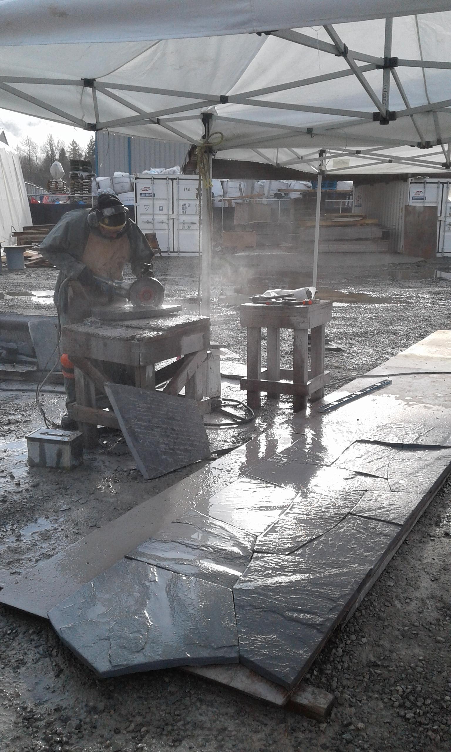 „Der gesamte Steinfußboden muss hydrophobiert werden. Das bedeutet, dass die Platten später kein Wasser aufnehmen, und dieses stattdessen abperlt. Platte für Platte wird hierbei in allen Räumen im und um das Haus bestrichen, aneinandergesetzt und verfugt.“